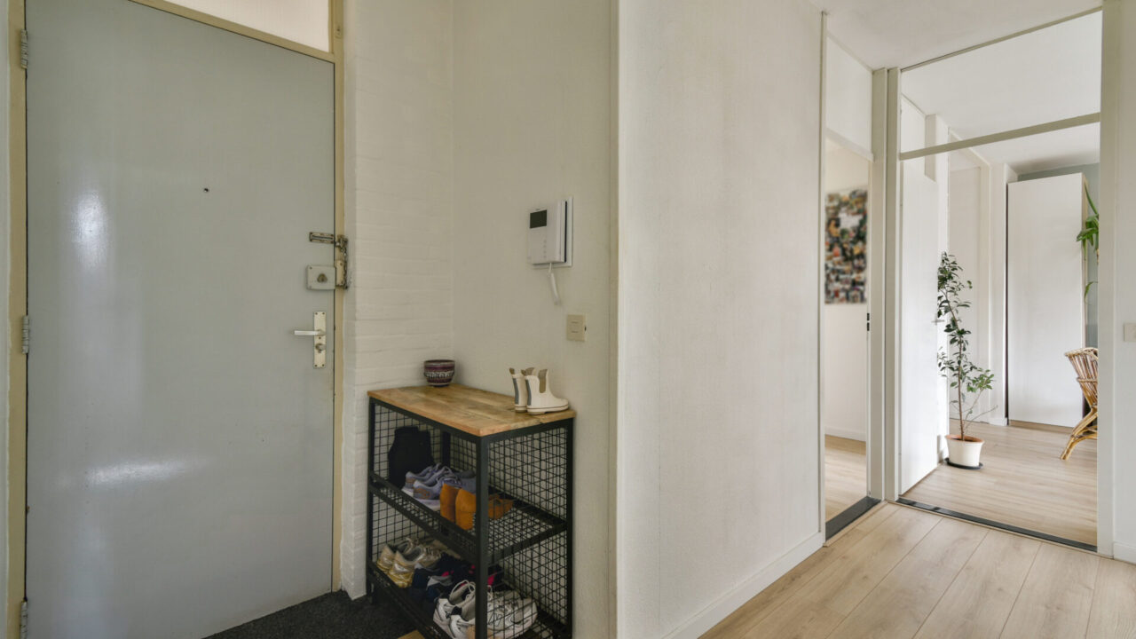 Het brede trappenhuis leidt naar de voordeur op de eerste verdieping (tweede woonlaag). Zodra je de woning binnenkomt, loop je rechtdoor naar een ruime slaapkamer, waarachter een van beide balkons ligt. Direct rechts is een bergruimte. Linksom bevinden zich aan je rechterhand de toiletruimte en badkamer en aan je linkerhand de hoofdslaapkamer, die een deur heeft naar het ruime balkon aan de achterzijde. Op het balkon aan de achterzijde heb je een heerlijk vrij uitzicht over de binnentuin en zit je privé. De gang eindigt in de L-vormige woonkamer met open keuken.